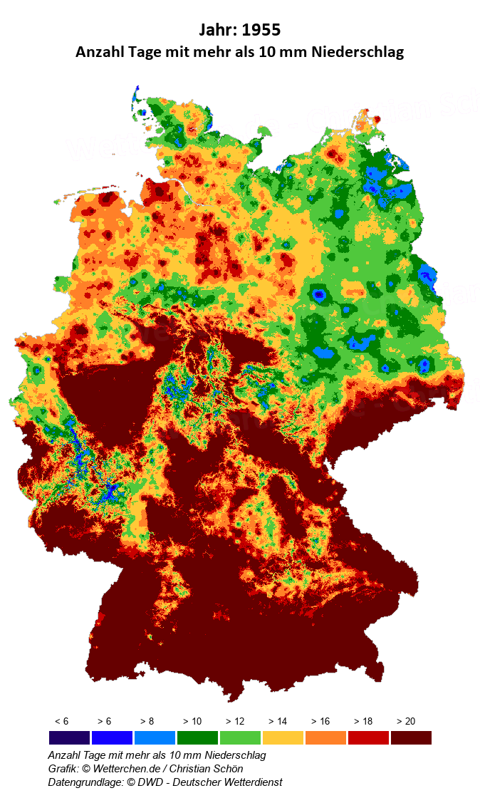 1955 - Anzahl Tage mit mehr als 10 mm Niederschlag