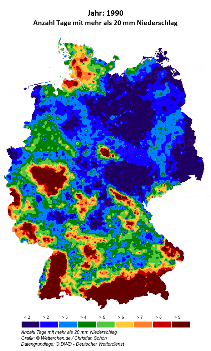 1990 - Anzahl Tage mit mehr als 20 mm Niederschlag