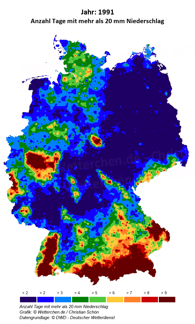 1991 - Anzahl Tage mit mehr als 20 mm Niederschlag
