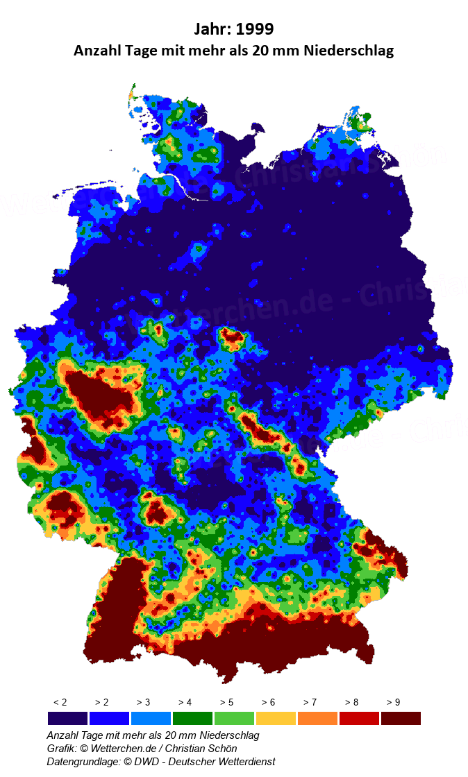 1999 - Anzahl Tage mit mehr als 20 mm Niederschlag