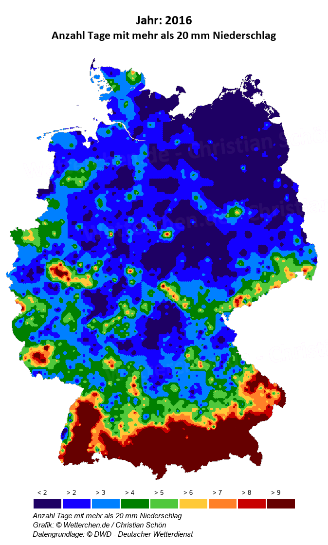 2016 - Anzahl Tage mit mehr als 20 mm Niederschlag