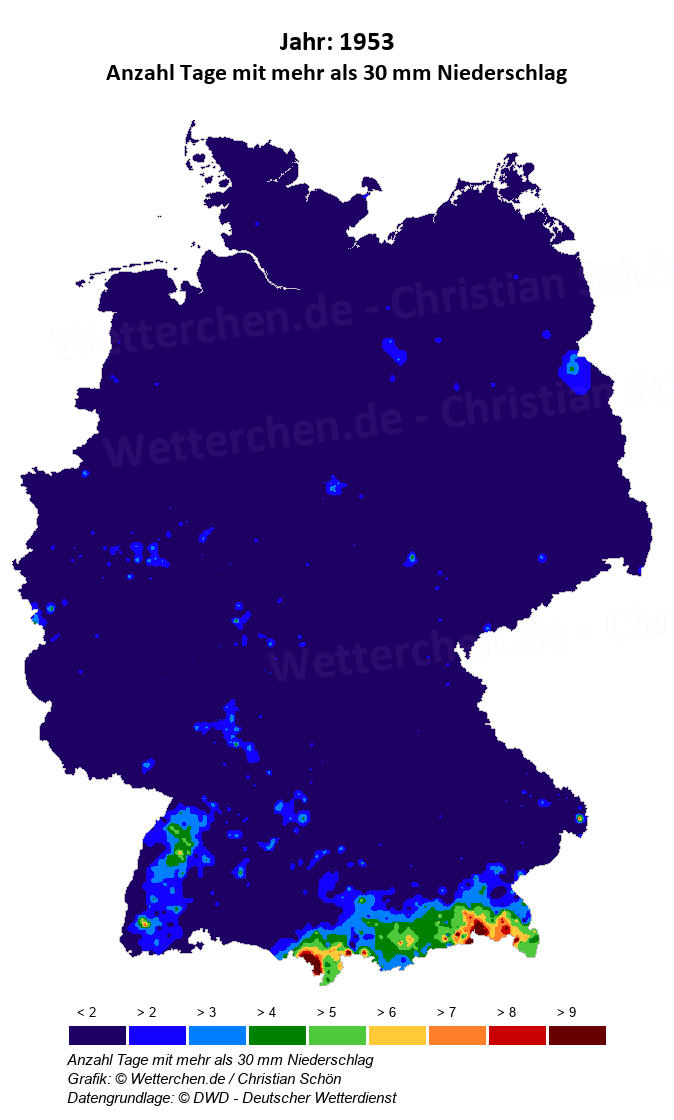 1953 - Anzahl Tage mit mehr als 30 mm Niederschlag
