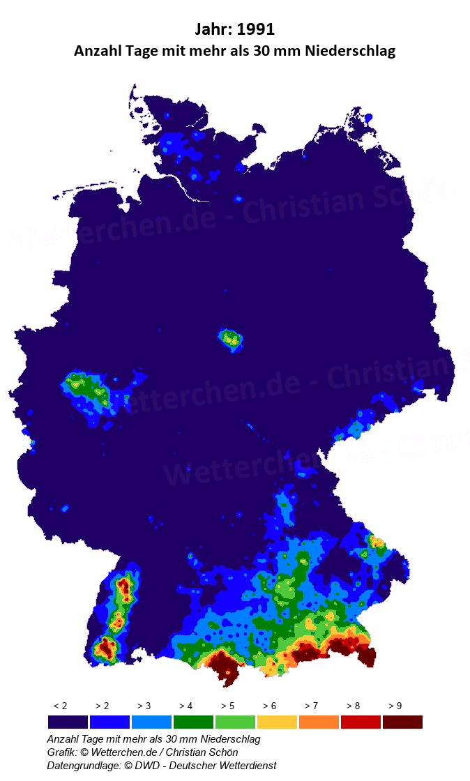 1991 - Anzahl Tage mit mehr als 30 mm Niederschlag