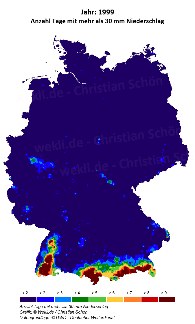 1999 - Anzahl Tage mit mehr als 30 mm Niederschlag