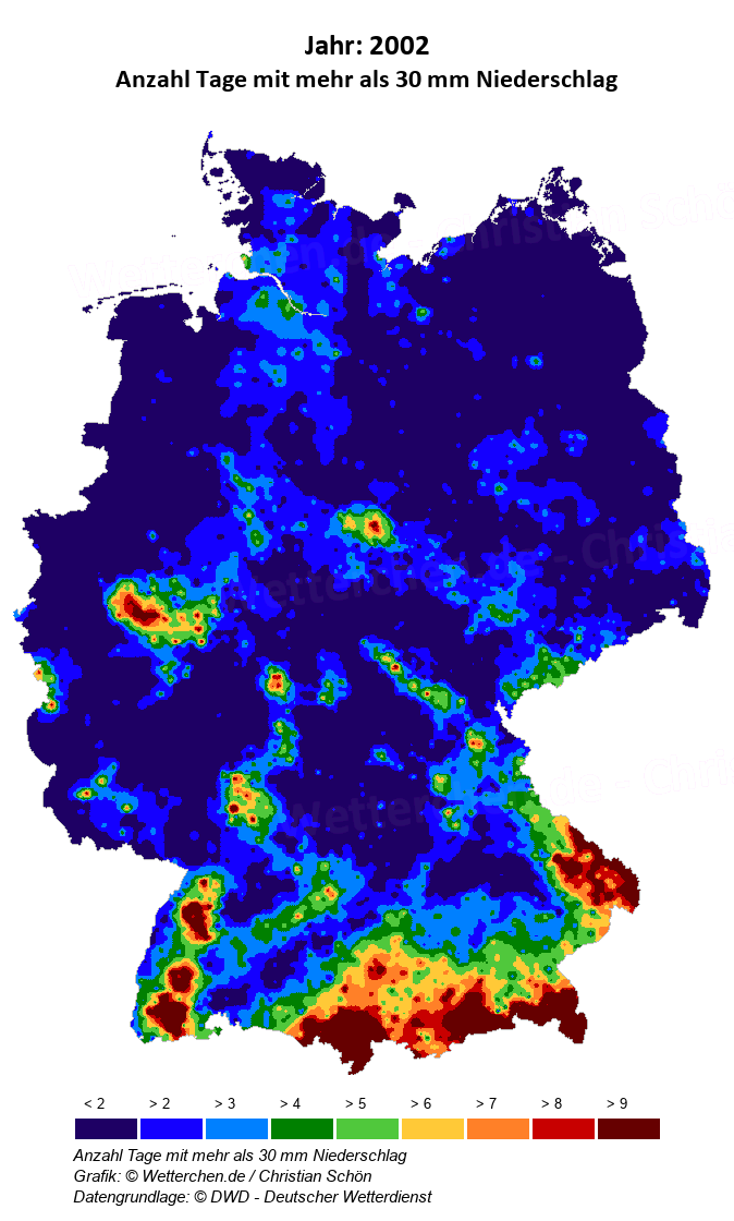 2002 - Anzahl Tage mit mehr als 30 mm Niederschlag