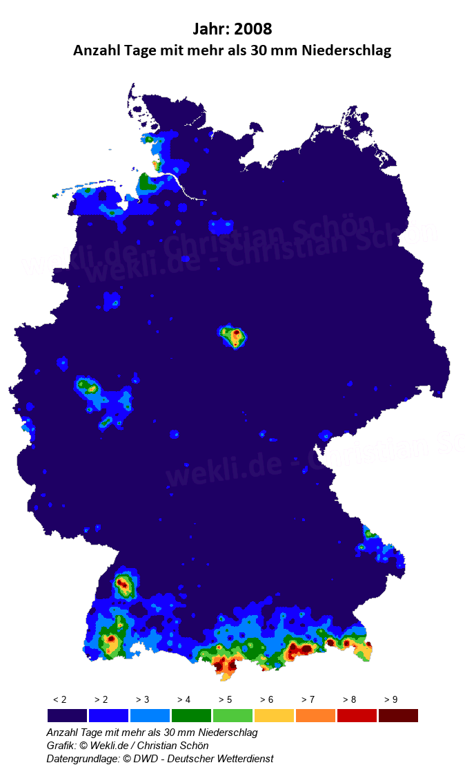 2008 - Anzahl Tage mit mehr als 30 mm Niederschlag