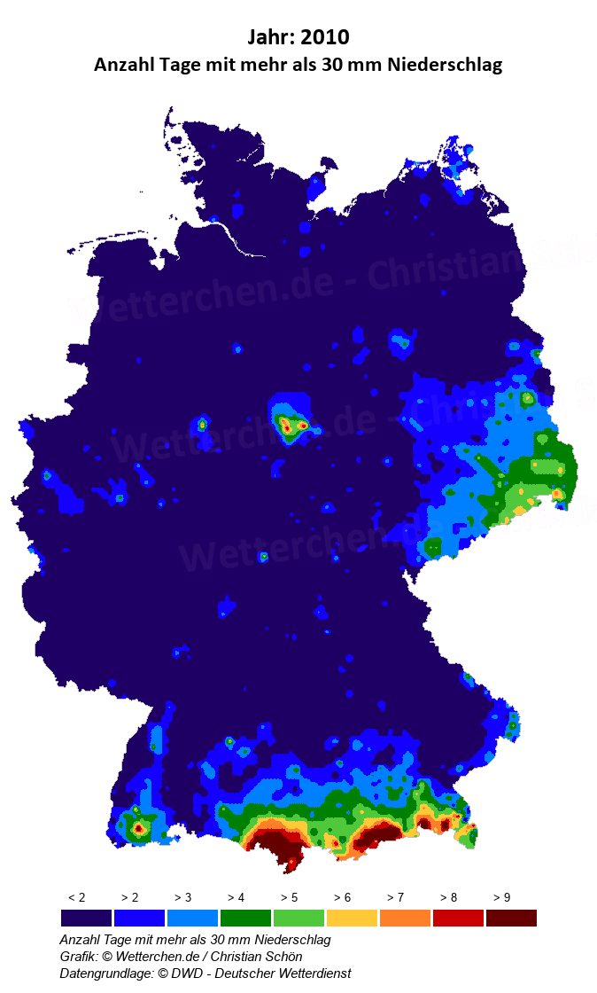 2010 - Anzahl Tage mit mehr als 30 mm Niederschlag