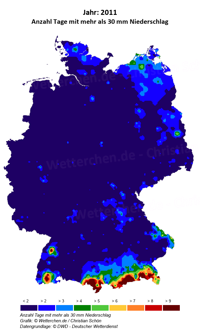 2011 - Anzahl Tage mit mehr als 30 mm Niederschlag