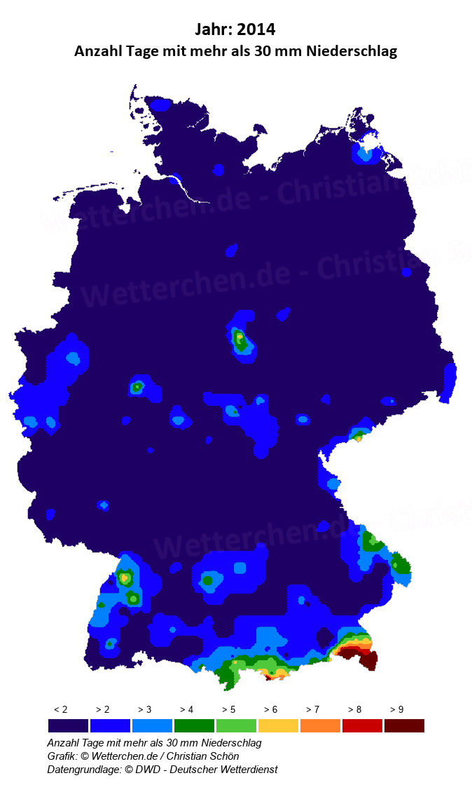 2014 - Anzahl Tage mit mehr als 30 mm Niederschlag