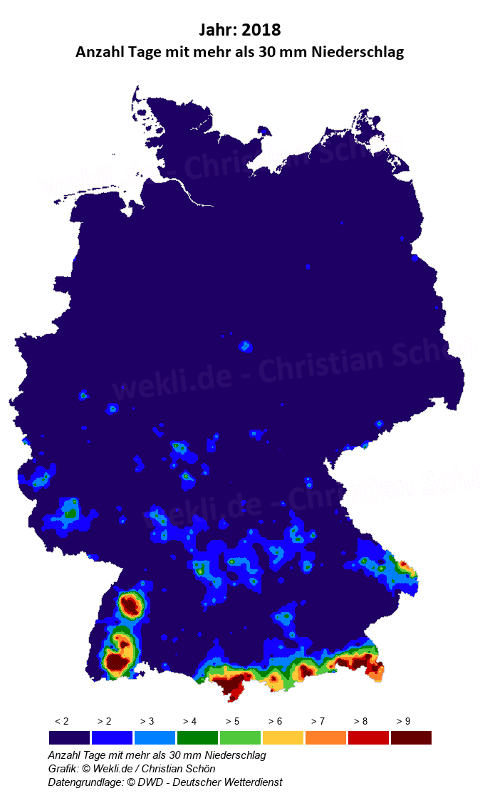 2018 - Anzahl Tage mit mehr als 30 mm Niederschlag