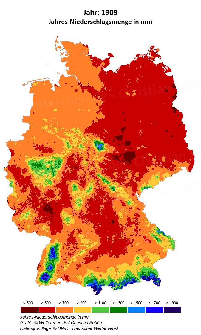 1909 - Jahres-Niederschlagsmenge in mm