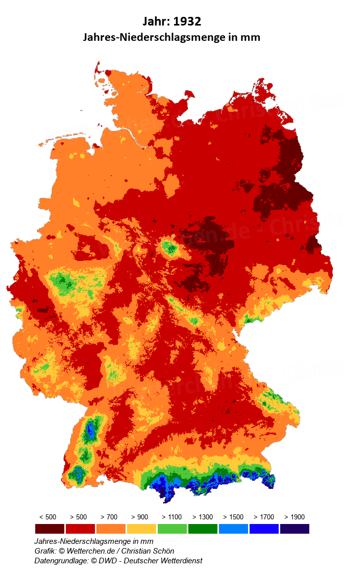 1932 - Jahres-Niederschlagsmenge in mm