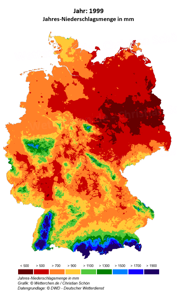 1999 - Jahres-Niederschlagsmenge in mm