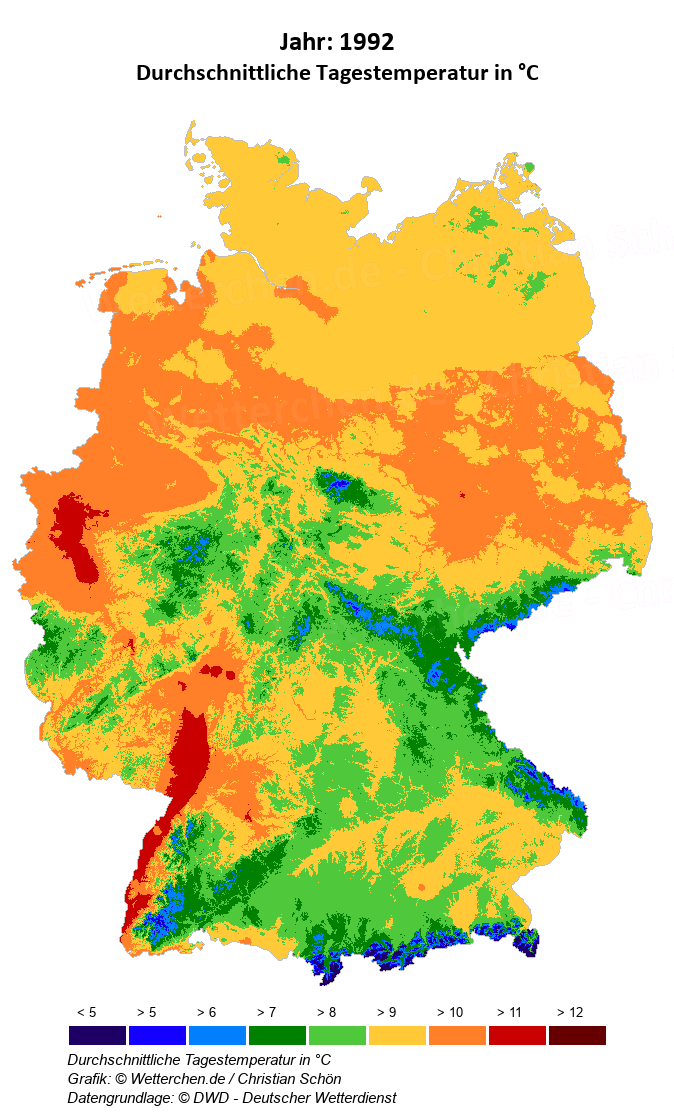 1992 - Durchschnittliche Tagestemperatur in °C