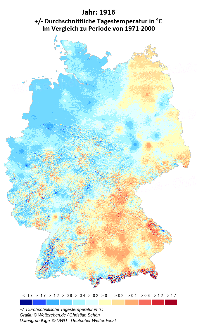 1916 - +/- Durchschnittliche Tagestemperatur in °C