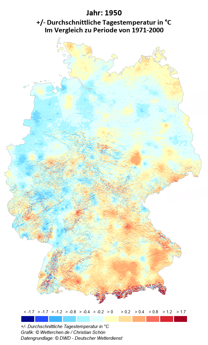 1950 - +/- Durchschnittliche Tagestemperatur in °C