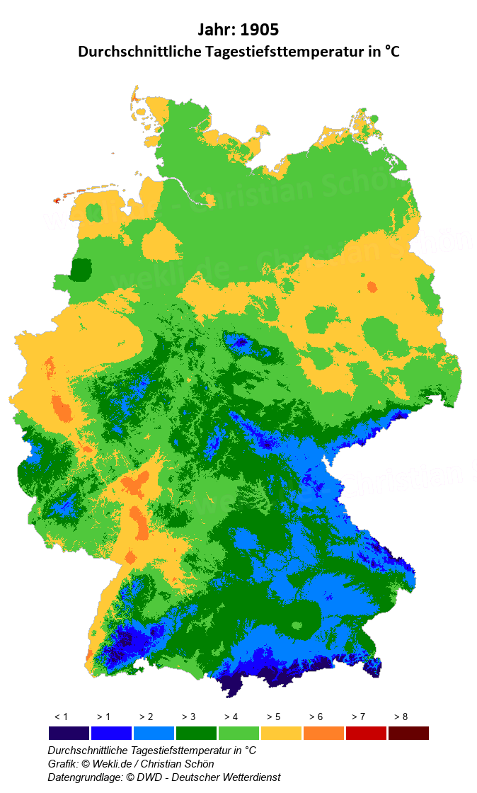 1905 - Durchschnittliche Tagestiefsttemperatur in °C