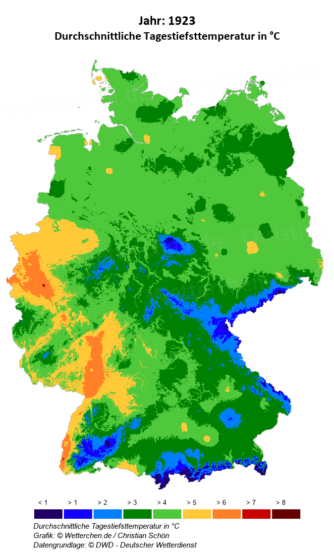 1923 - Durchschnittliche Tagestiefsttemperatur in °C