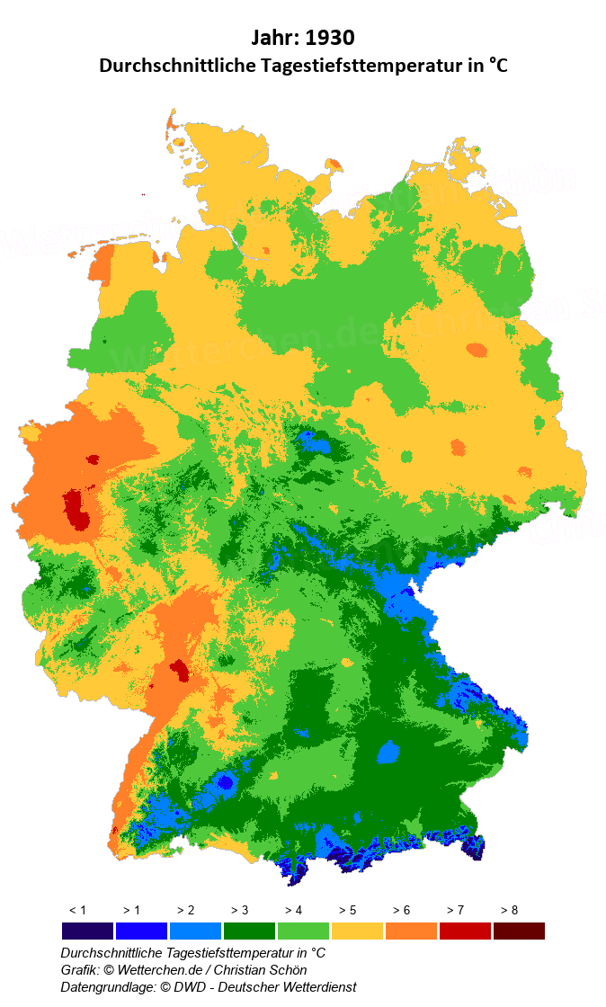 1930 - Durchschnittliche Tagestiefsttemperatur in °C
