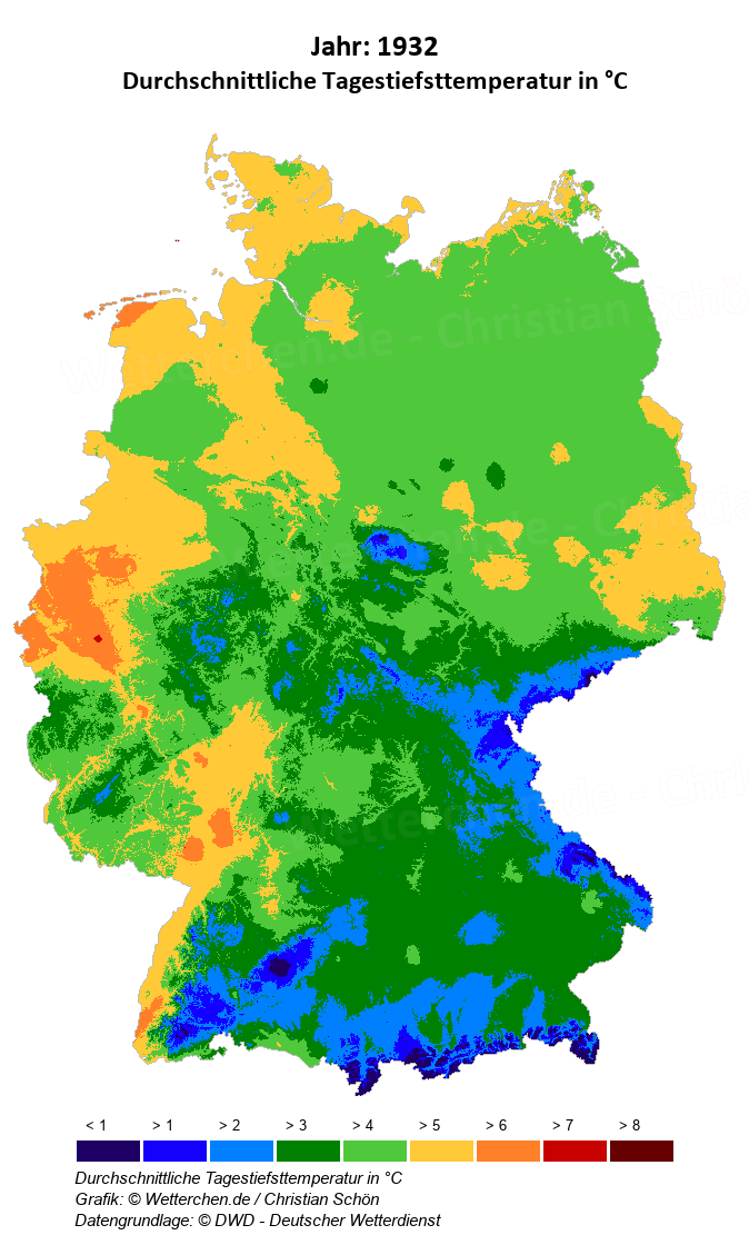 1932 - Durchschnittliche Tagestiefsttemperatur in °C