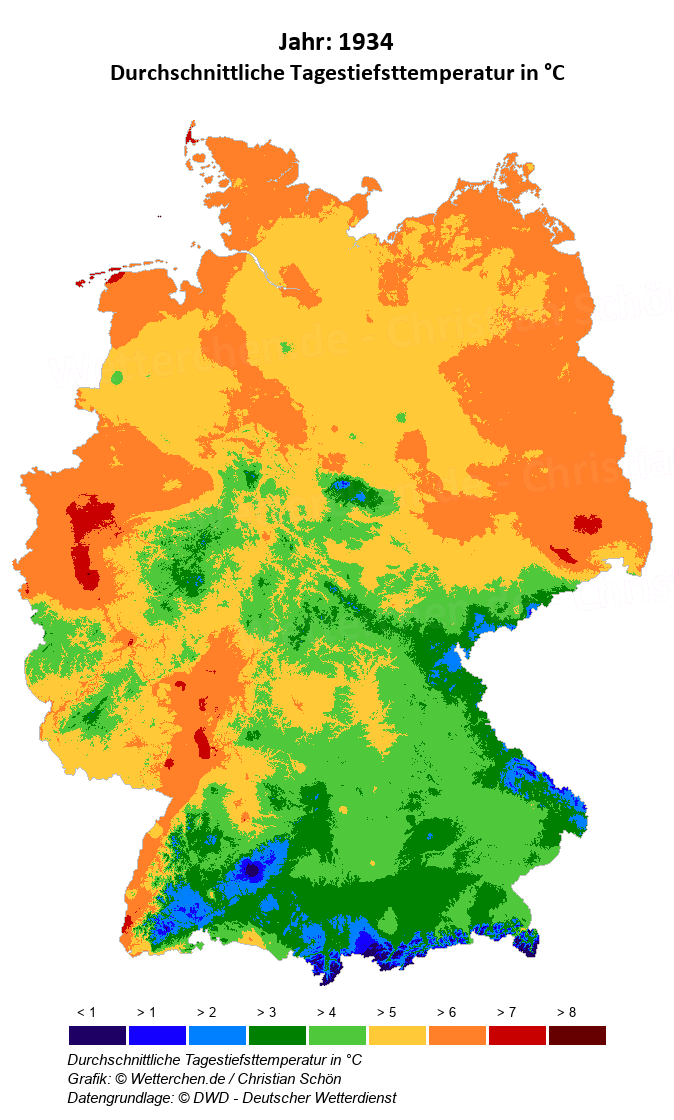 1934 - Durchschnittliche Tagestiefsttemperatur in °C