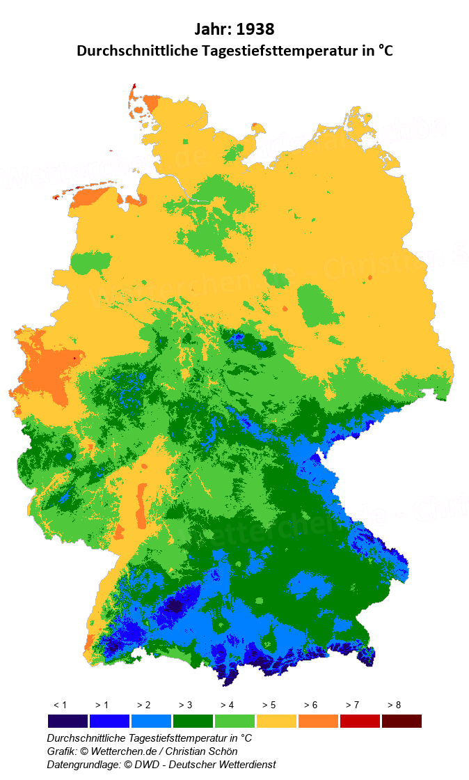 1938 - Durchschnittliche Tagestiefsttemperatur in °C