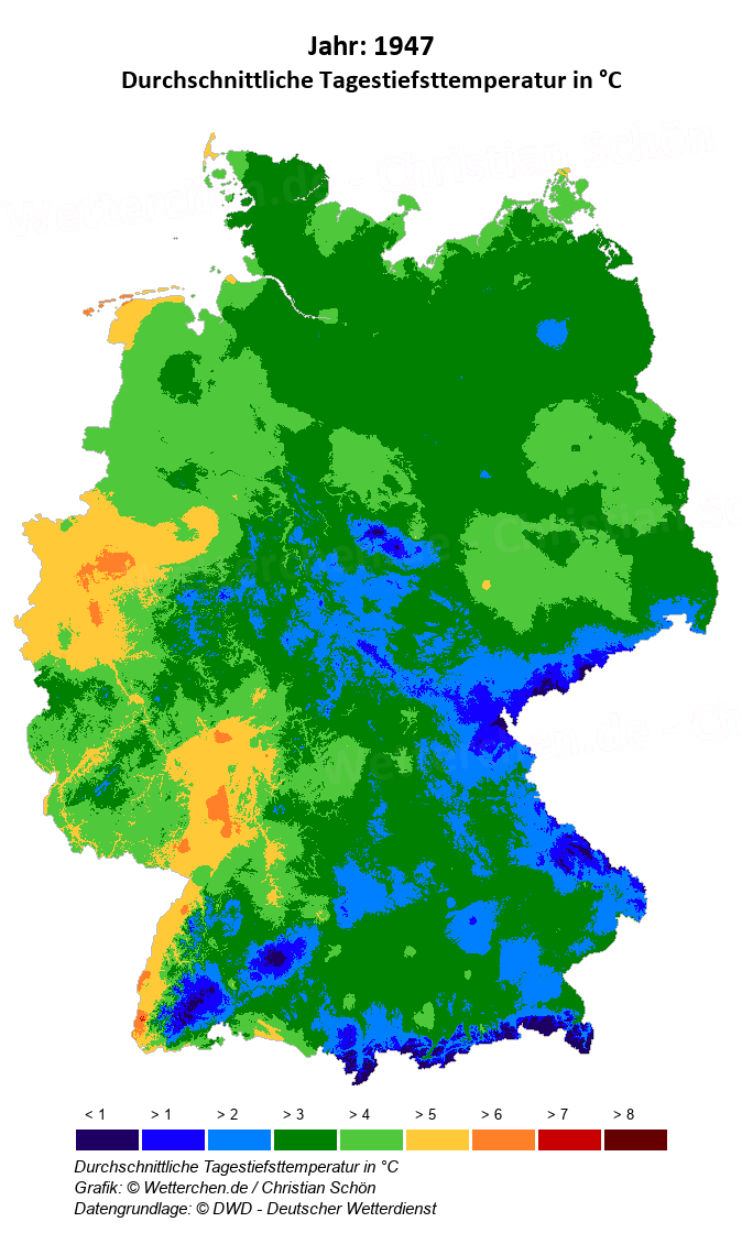 1947 - Durchschnittliche Tagestiefsttemperatur in °C