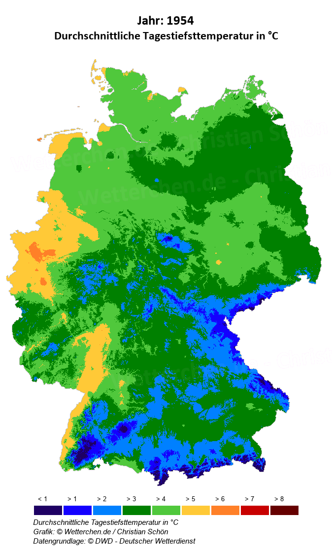 1954 - Durchschnittliche Tagestiefsttemperatur in °C