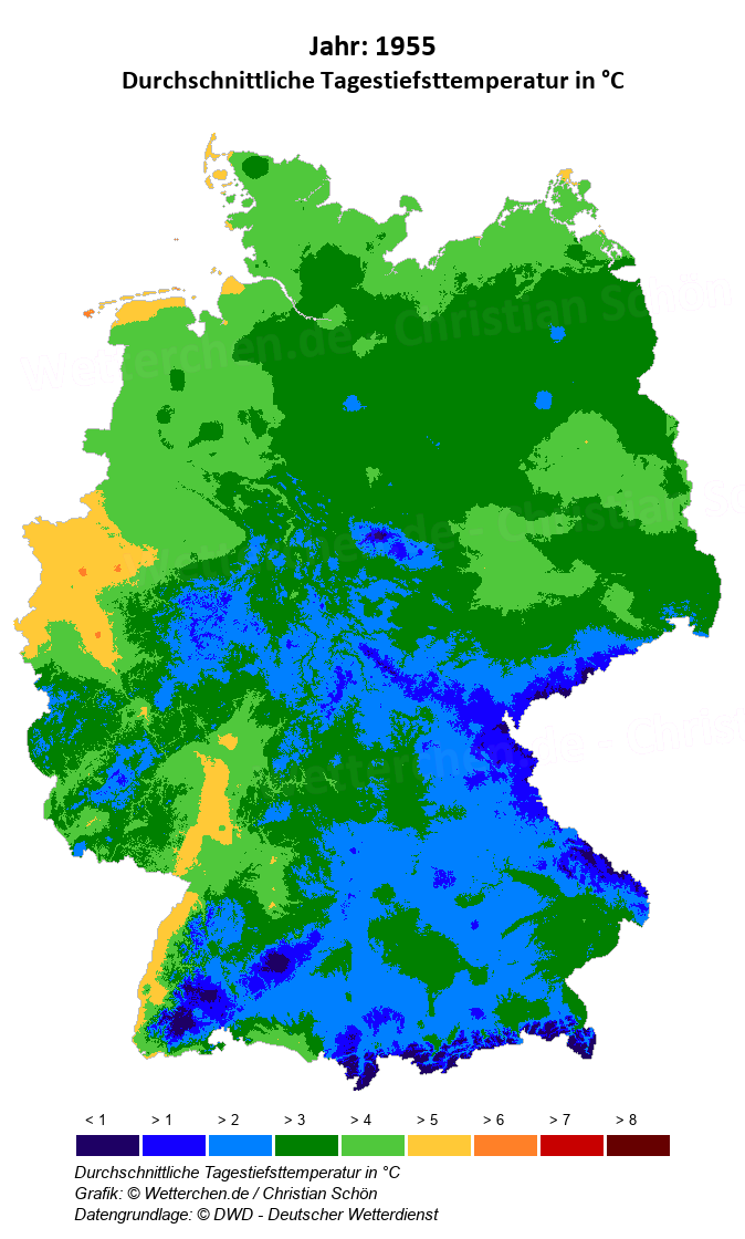 1955 - Durchschnittliche Tagestiefsttemperatur in °C