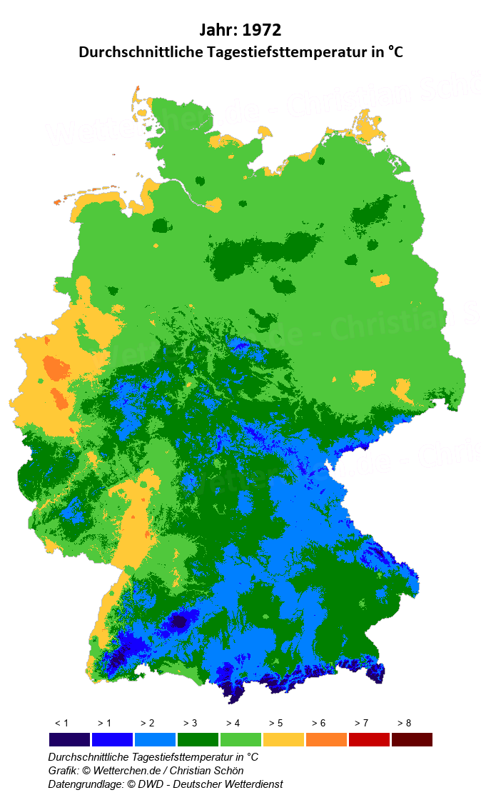 1972 - Durchschnittliche Tagestiefsttemperatur in °C