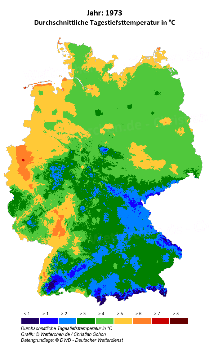 1973 - Durchschnittliche Tagestiefsttemperatur in °C
