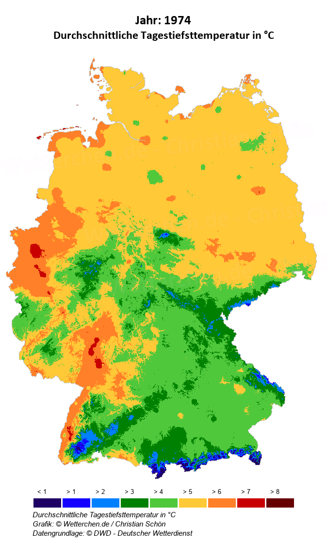 1974 - Durchschnittliche Tagestiefsttemperatur in °C