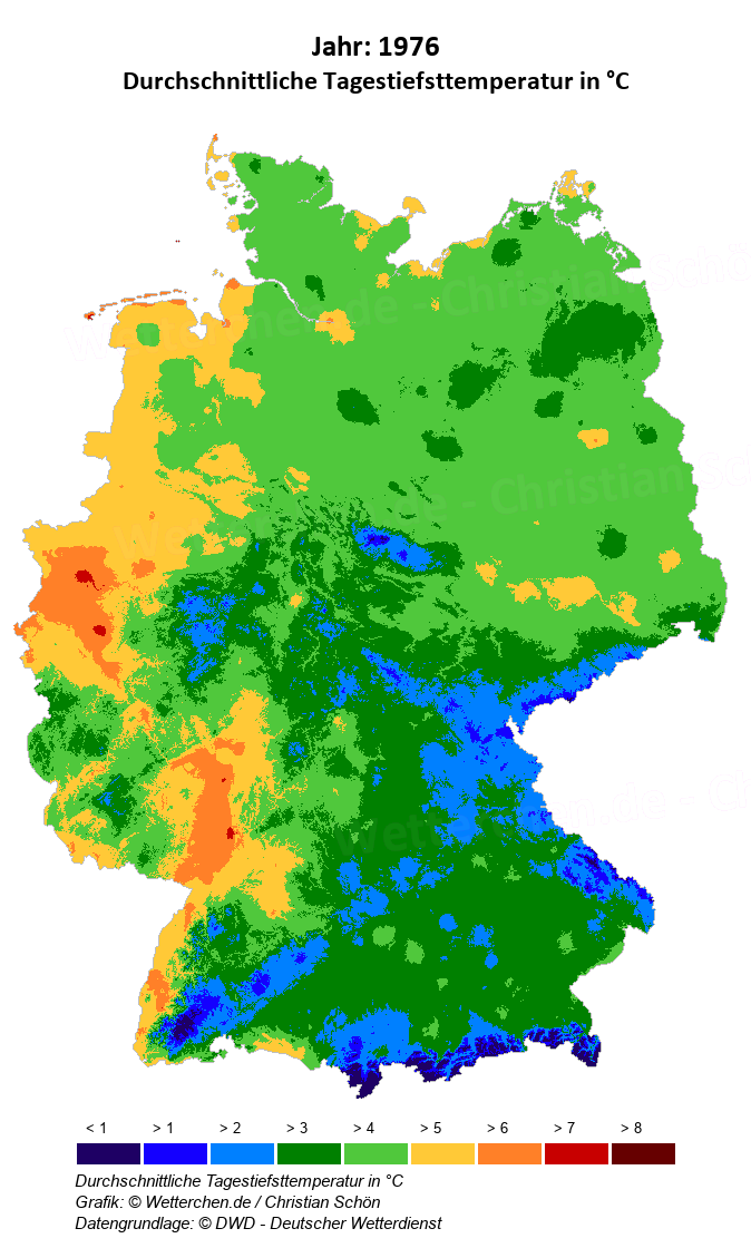 1976 - Durchschnittliche Tagestiefsttemperatur in °C