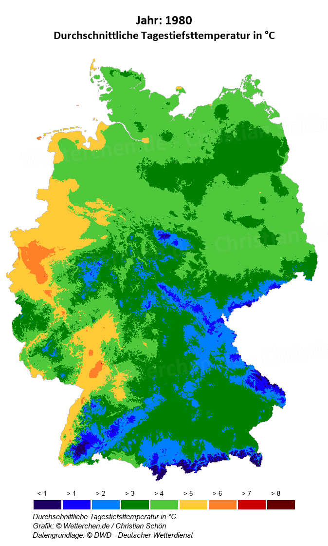 1980 - Durchschnittliche Tagestiefsttemperatur in °C