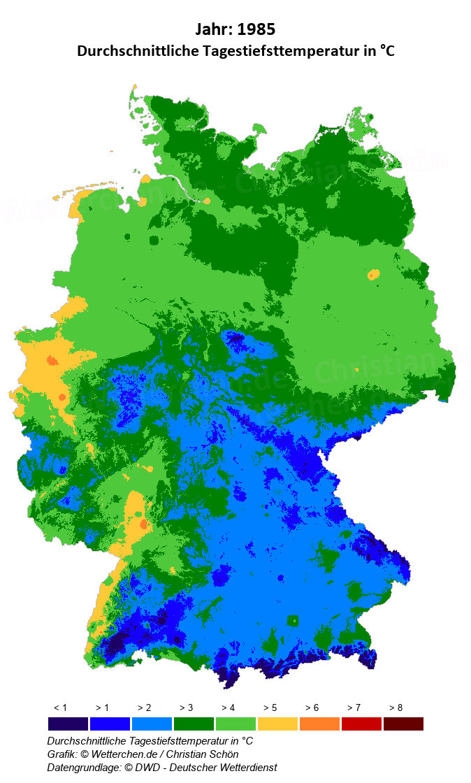 1985 - Durchschnittliche Tagestiefsttemperatur in °C