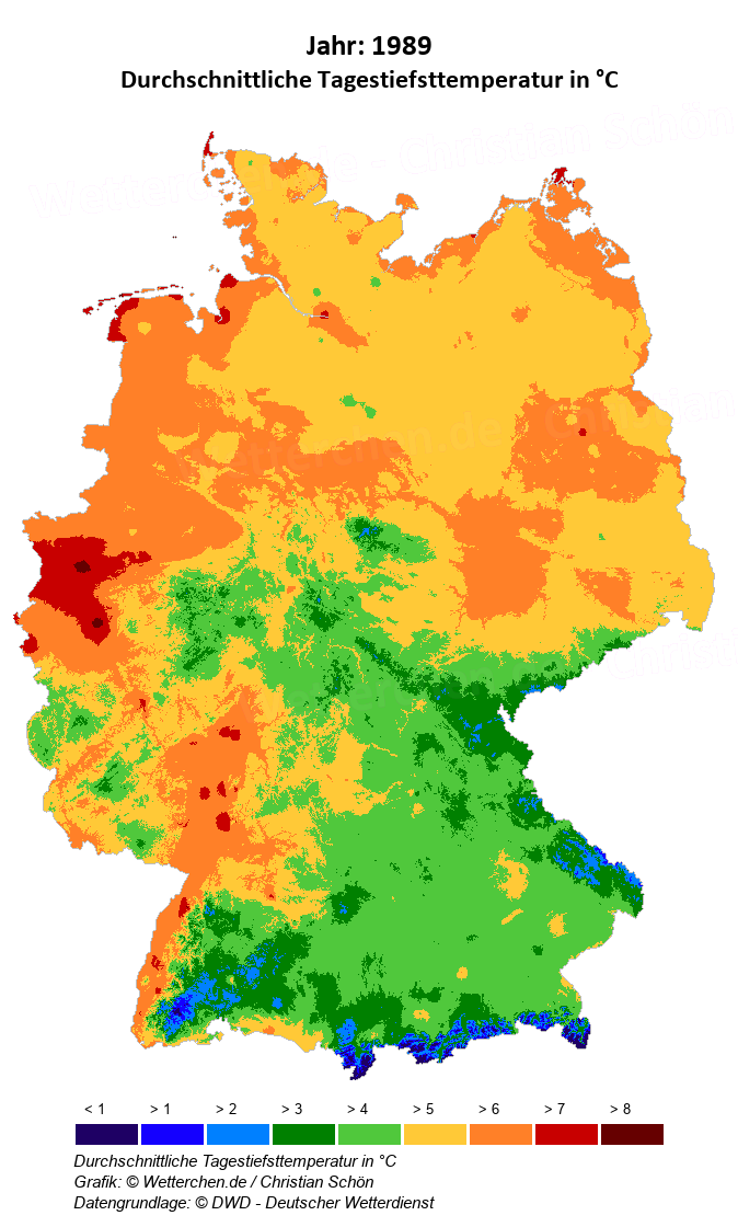 1989 - Durchschnittliche Tagestiefsttemperatur in °C