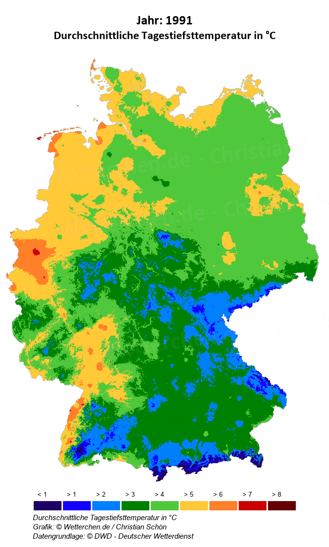 1991 - Durchschnittliche Tagestiefsttemperatur in °C