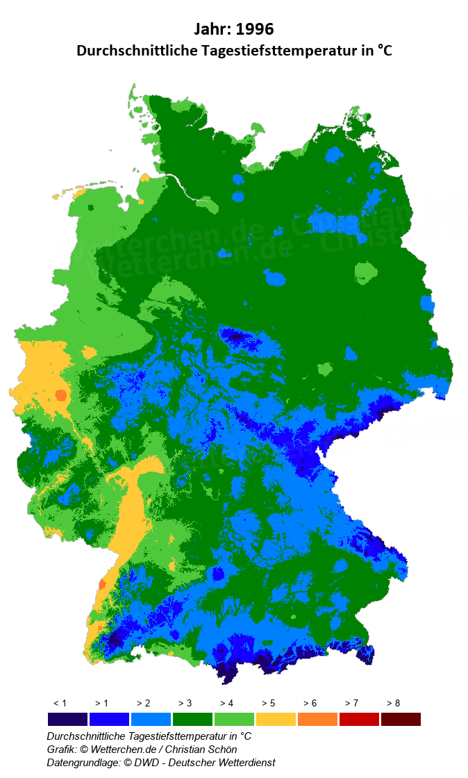 1996 - Durchschnittliche Tagestiefsttemperatur in °C