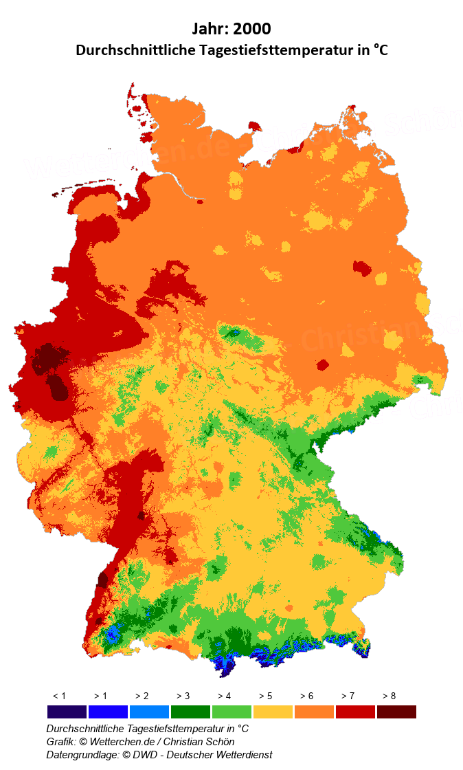 2000 - Durchschnittliche Tagestiefsttemperatur in °C