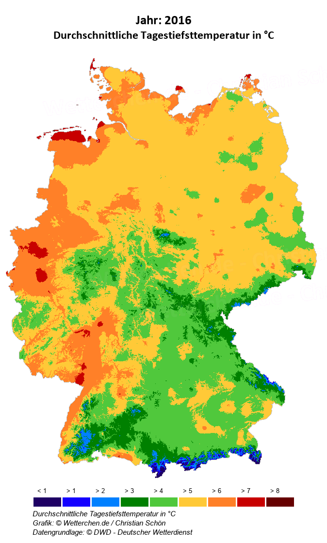 2016 - Durchschnittliche Tagestiefsttemperatur in °C