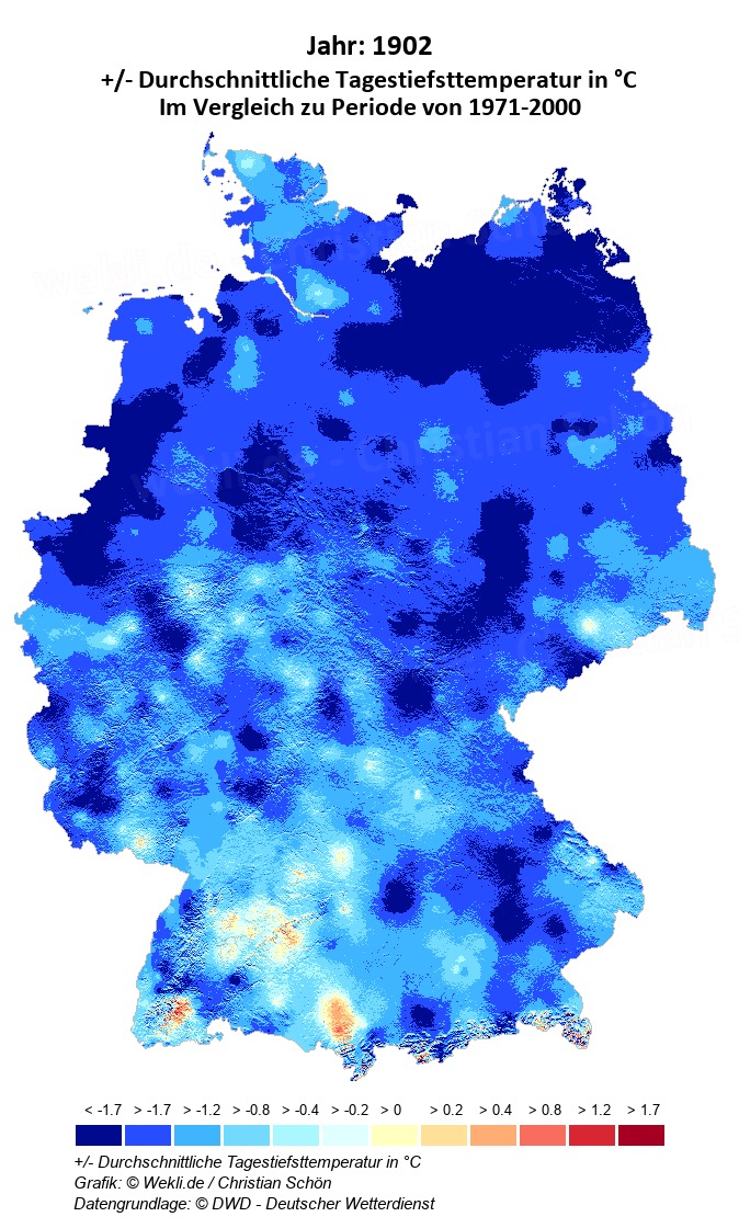 1902 - +/- Durchschnittliche Tagestiefsttemperatur in °C