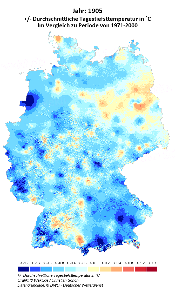 1905 - +/- Durchschnittliche Tagestiefsttemperatur in °C