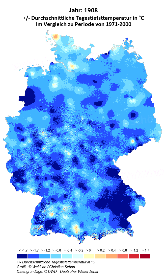 1908 - +/- Durchschnittliche Tagestiefsttemperatur in °C