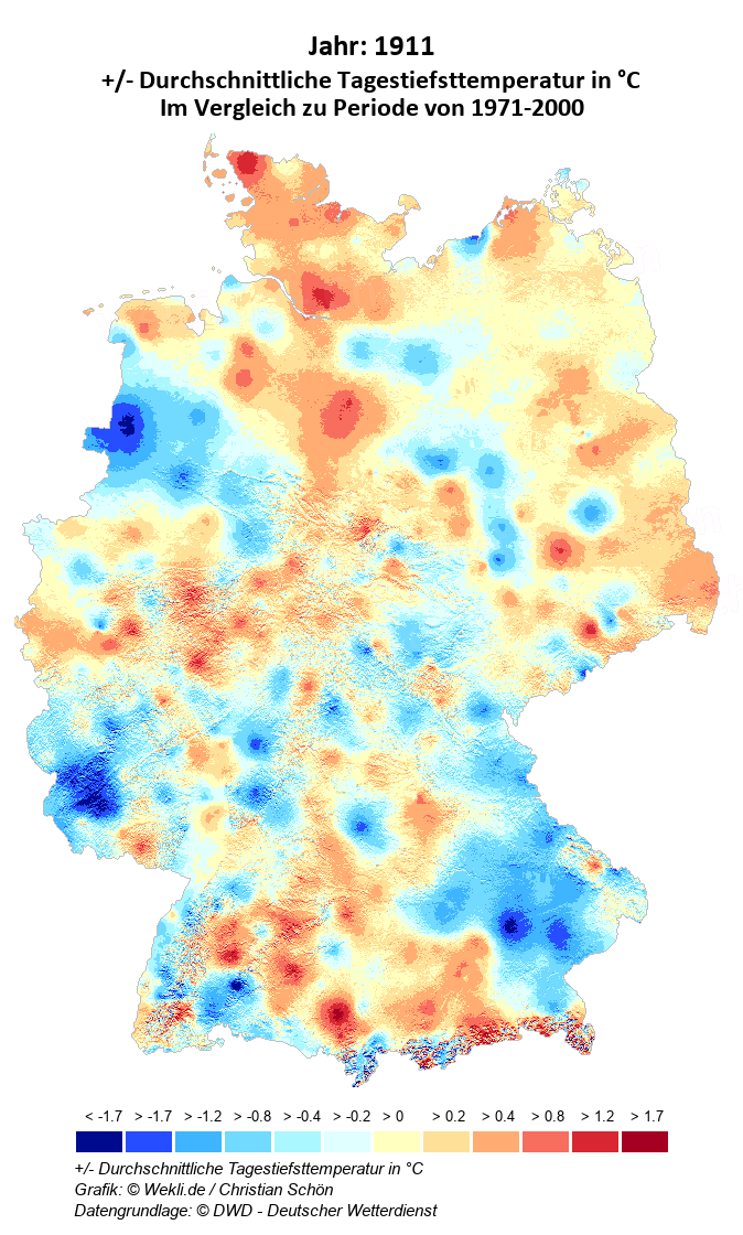 1911 - +/- Durchschnittliche Tagestiefsttemperatur in °C