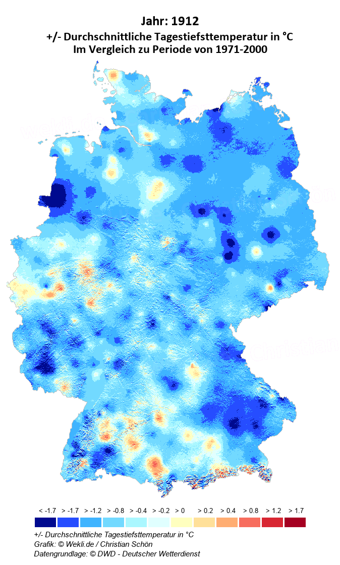 1912 - +/- Durchschnittliche Tagestiefsttemperatur in °C