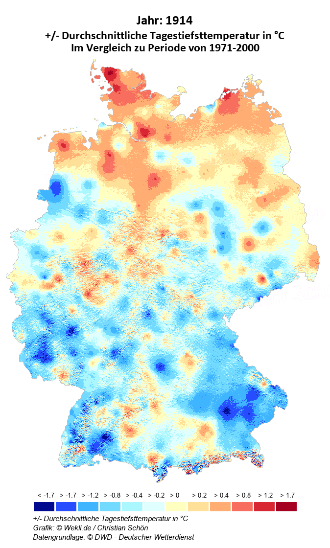 1914 - +/- Durchschnittliche Tagestiefsttemperatur in °C