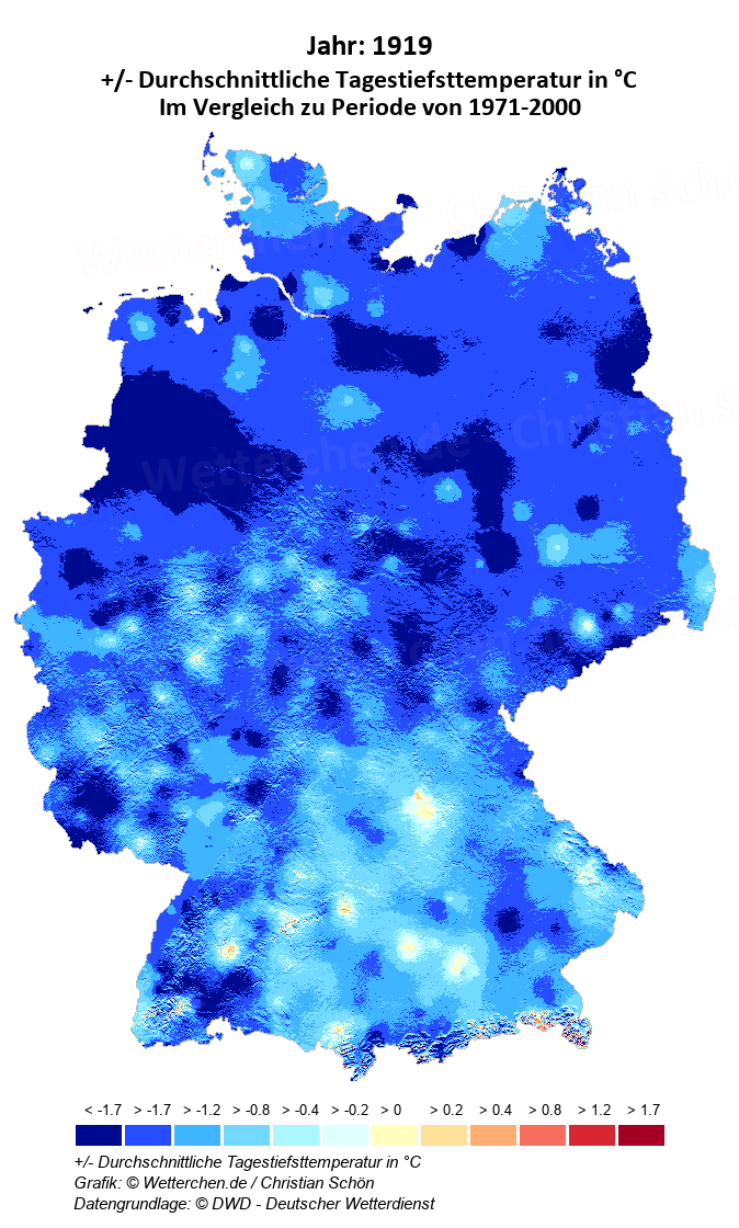 1919 - +/- Durchschnittliche Tagestiefsttemperatur in °C