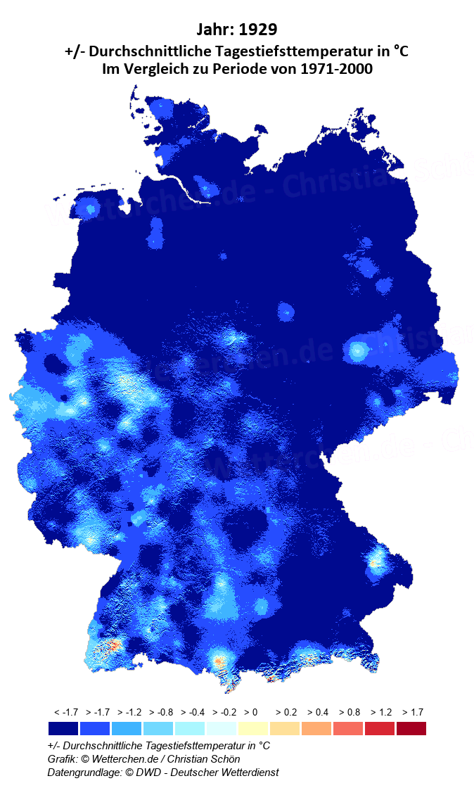 1929 - +/- Durchschnittliche Tagestiefsttemperatur in °C