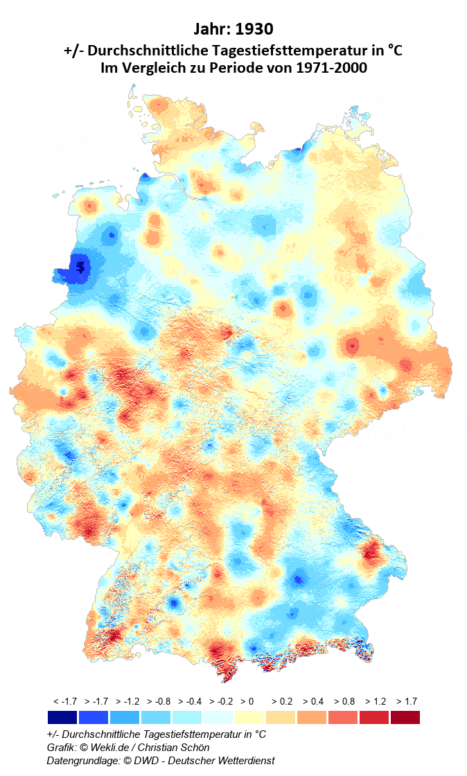1930 - +/- Durchschnittliche Tagestiefsttemperatur in °C