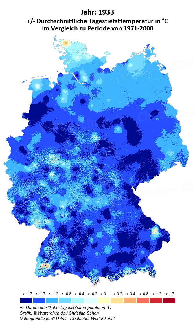 1933 - +/- Durchschnittliche Tagestiefsttemperatur in °C